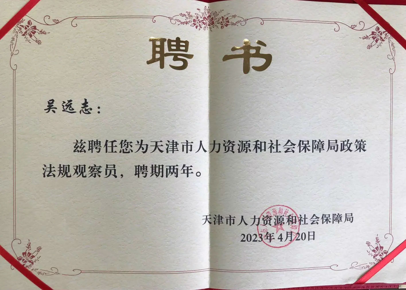 附属技校校长吴远志受聘天津市人社局首批政策法规观察员
