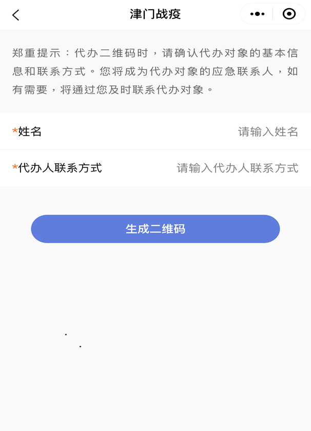 两、资助别人代庖两维码应用“为人代理”模块中的“为别人死成两维码”效用,为无Wechat的支属、同伙代庖两维码,死成的两维码可截图或者挨印应用(此两维码仅死成1次,必须保存)。由其入进公开场合时自动出示,以备核验。
