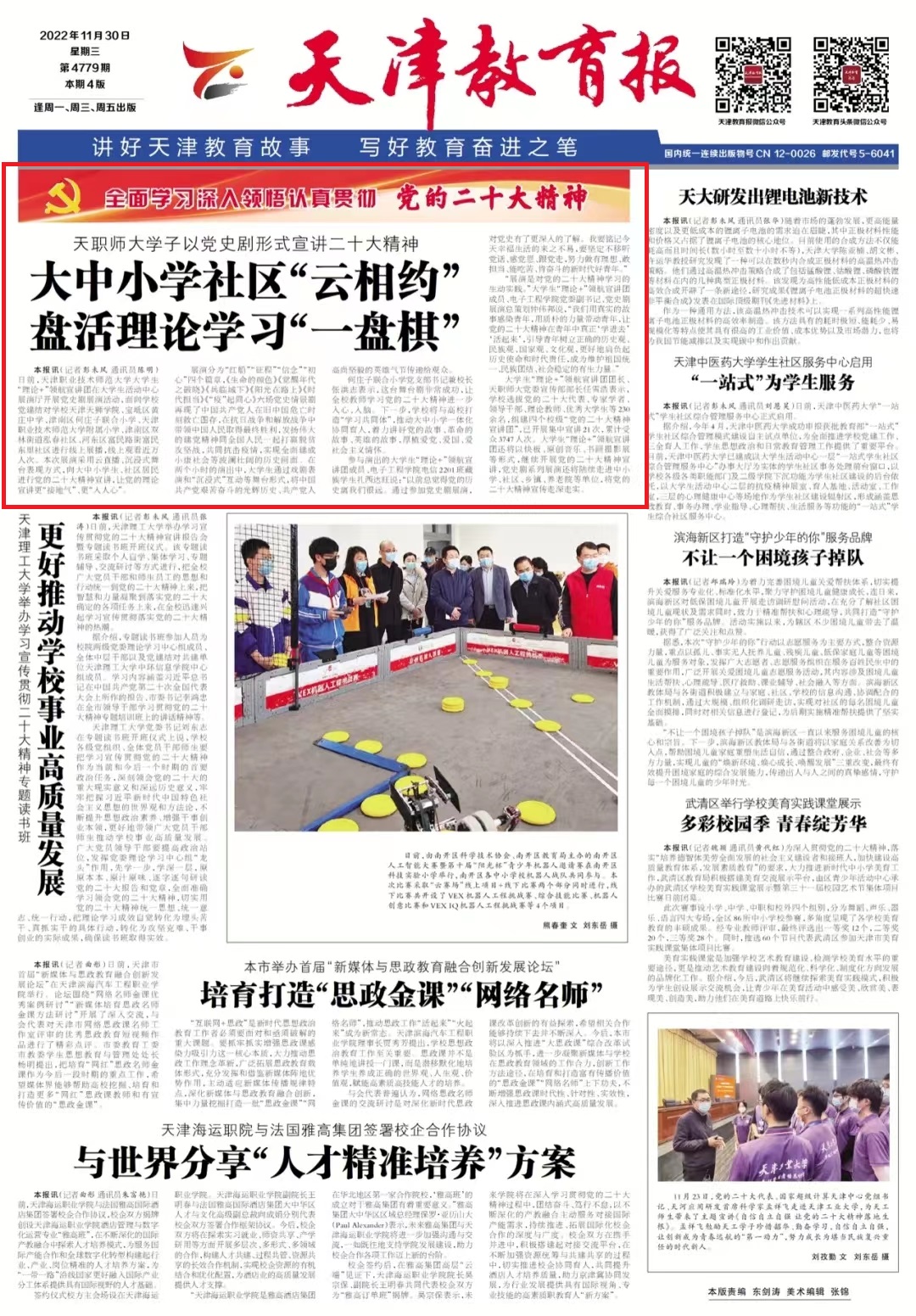 《天津教育报》:天职师大学子以党史剧形式宣讲党的二十大精神 大中小学社区“云相约”盘活理论学习“一盘棋”